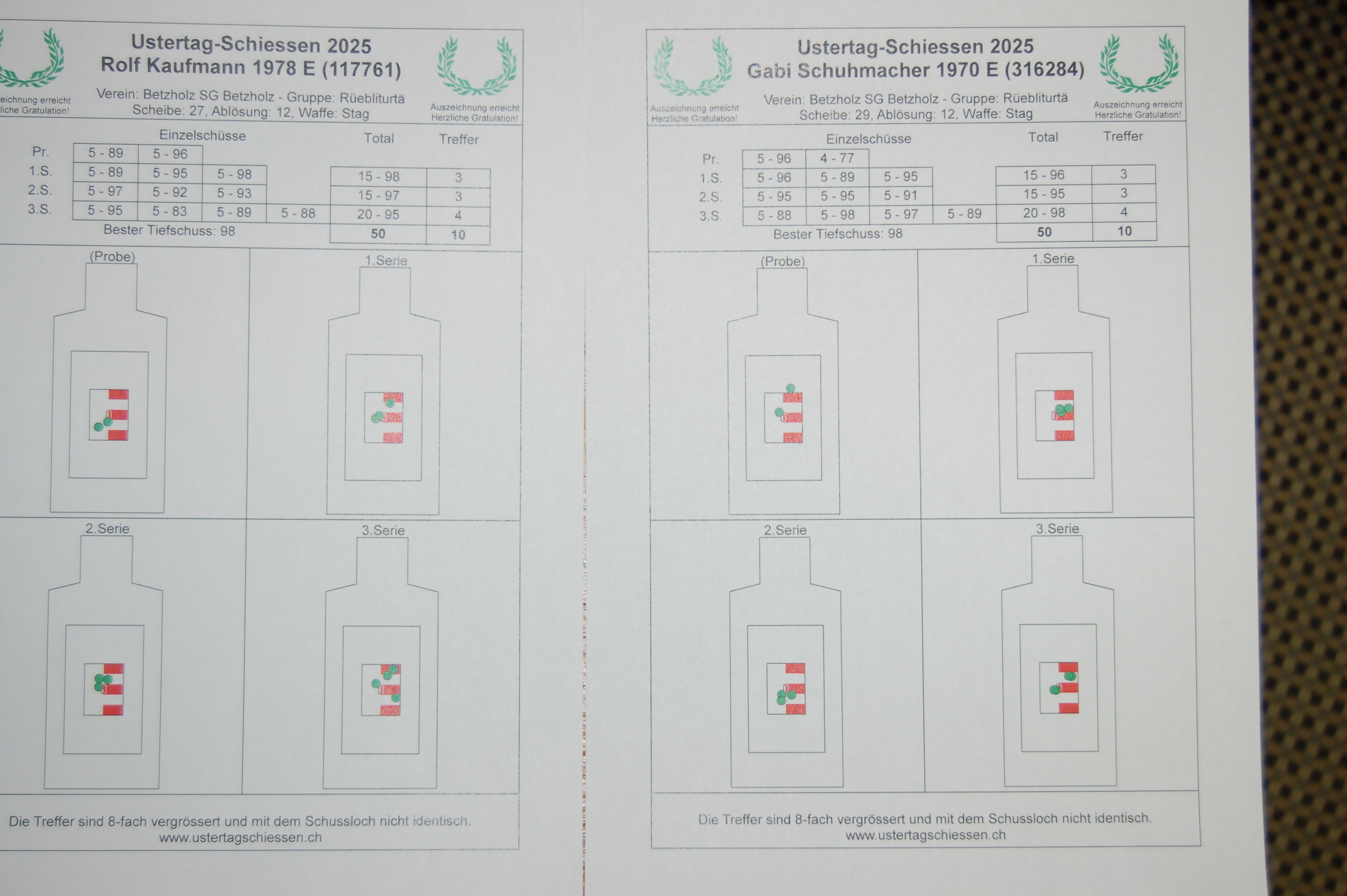 Heute haben die Betzholzschützen zugeschlagen! Es gab fünf Maximumschützen, zwei davon gehörten zu Betzholz: die führende Gabi Schuhmacher und Rolf Kaufmann im vierten Rang. Ebenfalls das Maximum erzielten Andreas Hälg, SV Zuzwil und Martin Schoch, SV Wallisellen, ein ehemaliger Ustertagschiessen-Schützenkönig.